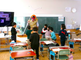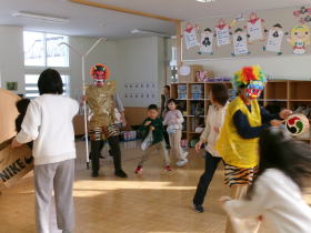 2月3日は節分の日。1年生・2年生教室に突如鬼が現れて、準備していた豆で豆まきをして、鬼退治をしました。1・2年生の勢いに鬼もたまらず逃げていました。