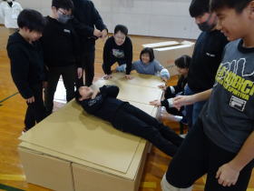 村役場職員の方々に魏指導いただきながら、5年生が防災教室を行いました。自治センターが避難所になる想定で、避難所運営をカードで体験したり、段ボールベッド組み立て体験をしたりしました。