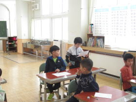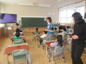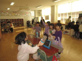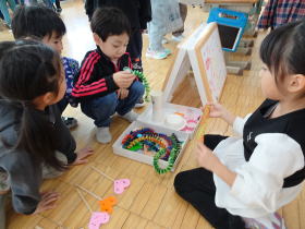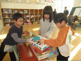 新篠津村では、近接した場所に保育園、小学校、中学校があります。この時期に次年度1年生になる年長の子どもたちが、現1年生と交流をしました。1年生はこの日のために、いろんな種類のお店屋さんを準備し、みんなに楽しんでもらうことができました。