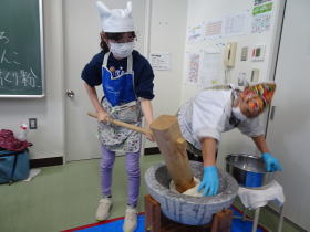 6年生がふれあい塾のみなさんの力を借りて、餅つき体験をしました。丸めた餅の中身は、4月から畑で育てた小豆で作ったあんこです。つきたてのおもちとあんこは相性バッチリ。みんなおいしくいただきました。