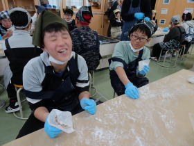 5年生が札幌西岡北との交流で育てたお米を使って、ふれあい塾のみなさんに教えてもらいながら「五平餅」を作りました。炊きたてのごはんをつぶして、味噌を塗ってフライパンで焼きました。いい焼き目がついて香ばしいいいにおいが学校中に広がっていました。とてもおいしかったですね。