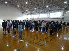 新篠津村では、小中一貫教育として5年生と中学2年生が合同で新体力テストの測定を行っています。中学校の体育館までは、徒歩5分ほどの近距離です。中学生に指導を受けながら、一生懸命記録を伸ばそうと頑張っていました。