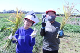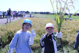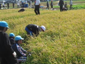 5月に田植えをした稲が順調に実り、例年よりも少し早めに収穫の時期を迎えました。西岡北小の5年生と一緒に稲刈り体験をしました。普段使ったことのない鎌を持って、一人ひとり稲を刈っていきます。最初はぎこちない手つきでも、次第に慣れて素早く刈れるようになっていました。