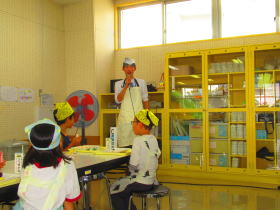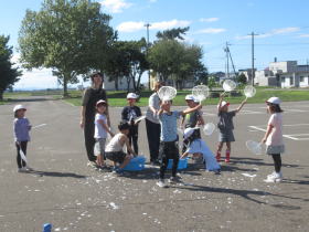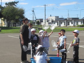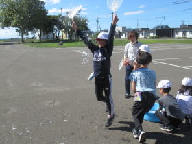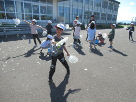 天気が良かったので、1年生は児童玄関前の駐車場で「シャボン玉遊び」をしました。少し風が強めで、シャボンを作るうちわをかざすと、どんどんシャボン玉ができて飛んでいきました。