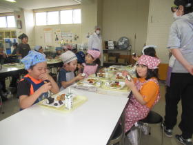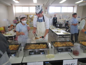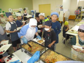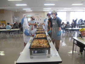 この日は1年に一度の「鉄板焼き給食」です。いつものランチルームに鉄板がずらっと並び、焼うどんや焼肉、玉ねぎなどの野菜、サケなどなどたくさんの具材を鉄板上で焼いたものをみんなで食べました。みんな楽しみにしていたようで、用意された食材はほほとんど食べきりました。