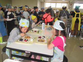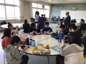 新篠津小学校は給食センターとつながっていて、給食時間は全校児童が食堂に移動してみんなで給食を食べます。本日のメニューは、食パン、網焼きハンバーグ、ツナポテトサラダ、コンソメスープ、スライスチーズ、牛乳です。食事を通して、多くの学年が交流できることはとても素晴らしいことです。