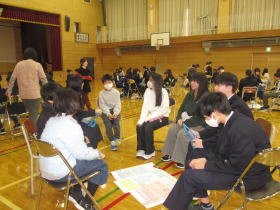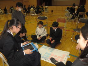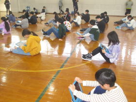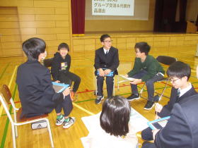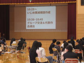 新篠津村小中一貫教育の活動で、今年は5.6年が中学校に行って、中1、中2の先輩方と一緒に集会を行いました。テーマは「いじめを許さない学校づくり」でした。動画視聴やグループ交流、標語づくりといろいろなことを考えて話し合う活動ができました。