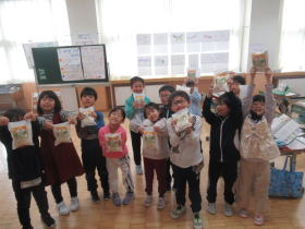 新篠津村では、「子ども読書推進計画」に基づいて小学校1年生に絵本と図鑑の2冊をプレゼントする取組を行っています。各家庭に希望する本を聞いて、読んでみたい本を贈られます。この日贈呈式にスペシャルプレゼンターで村のキャラクター「おこめちゃん」が来て、直接手渡ししてくれました。