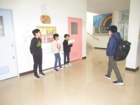 12月3日〜5日まで児童会環境委員会で呼びかけて、赤い羽根共同募金の活動をしました。集まった募金を贈呈するため、新篠津村社会福祉協議会の方に来ていただいて贈呈式を行いました。