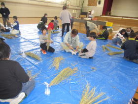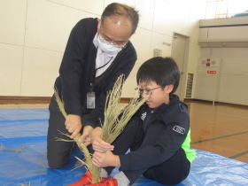 5年生のふれあい塾の皆さんとの活動はこれが最後です。総合の学習で育てた稲を乾燥させてできた「稲わら」を使って、しめ縄づくり体験をしました。わらをねじりながらしめ縄の形にしてくのがとても難しく、悪戦苦闘しながら作ることができました。