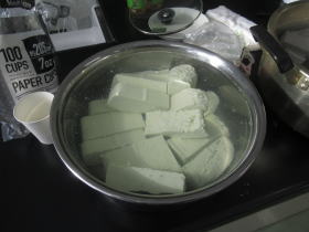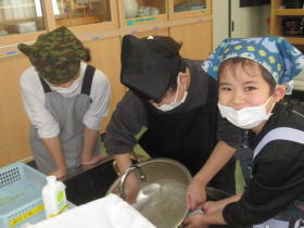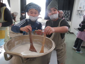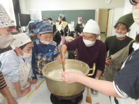 4年生は学校近くの畑で、4月から「大豆」を育てていました。この日、いつもお世話になっている地域の方に外部講師として来ていただき、育てた大豆を使って「とうふ作り体験」をしました。大きな鍋で煮た大豆がどうやって豆腐になるのか、みんな興味津々で作業をしました。とてもおいしい豆腐ができましたね。