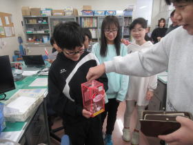 3年生社会科「わたしたちの村の歩み」の学習で、中学校の敷地内にある郷土資料室を見に行きました。昔の道具が何に使われていたのか、いつの時代に使われていたのかなどふれあい塾のみなさんが丁寧に教えてくれて、タブレットにたくさん書き込んでいました。